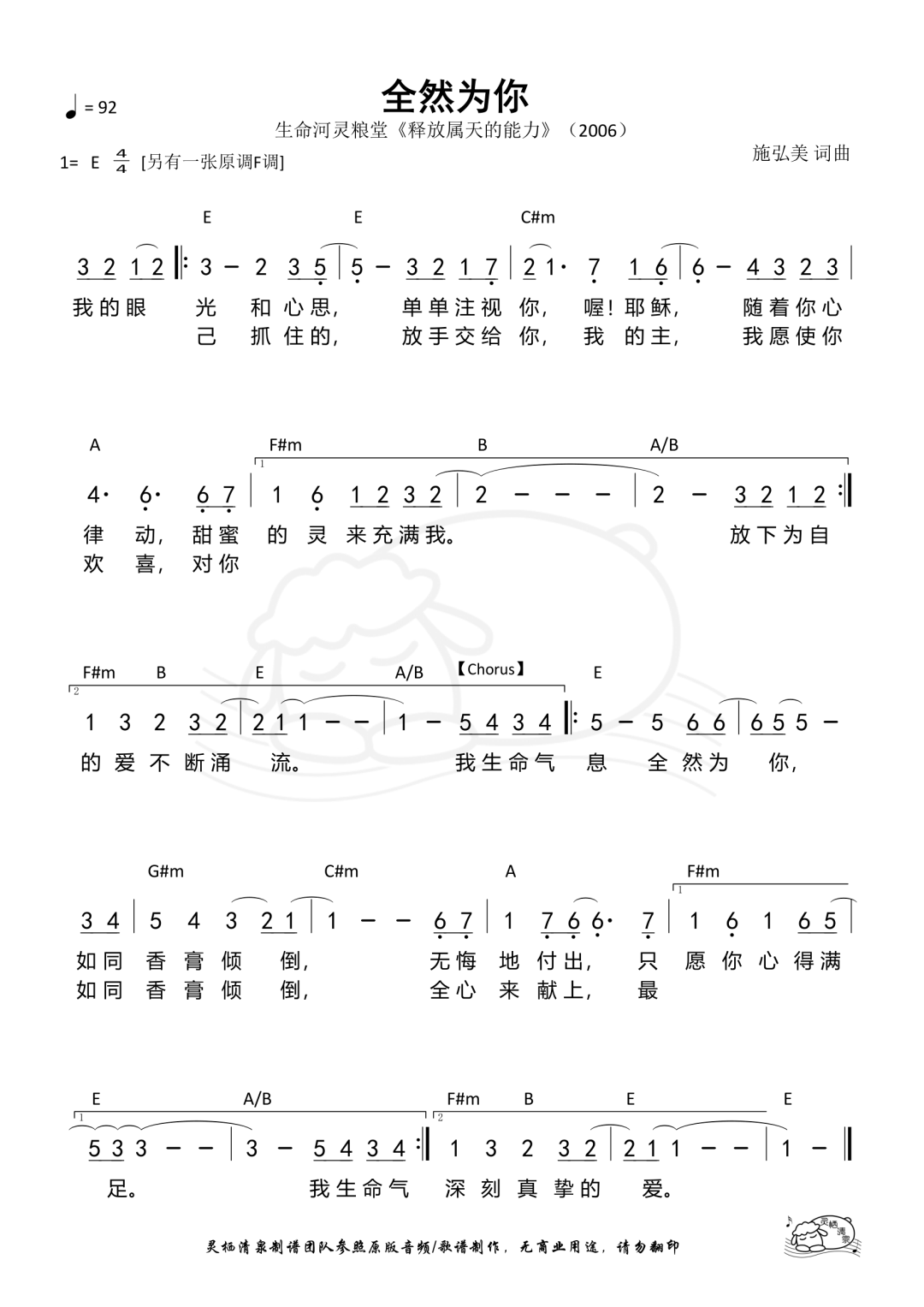 +- 首页 生命河灵粮堂 正文 音频播放地址: 视频播放地址: 【全然为你 All For You, Lord】 我的眼光和心思 单单注视你 喔 耶稣 随著你心律动 甜蜜的灵来充满我 放下为自己抓住的 放手交给你 我的主 我愿使你欢喜 对你的爱不断涌流 我生命气息 全然为你 如同香膏倾倒 无悔地付出 只愿你心得满足 我生命气息 全然为你 如同香膏倾倒 全心来献上 最深刻真挚的爱 歌谱: 赞美诗歌未整理以斯拉盛晓玫祝瑞莲生命河灵粮堂小羊诗歌Jesus Image天韵合唱团新酒使命团我心旋律JLSS BlessedThe Hope佳音 赞美之门 收藏 分享 链接