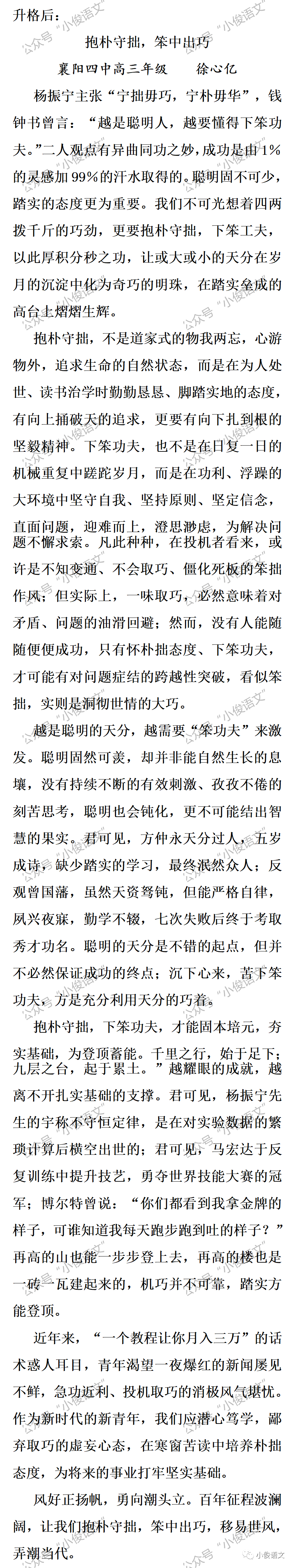 钱钟书先生和杨振宁先生分别是人文科学领域和自然科学领域天赋极高的“天才”,但他们都强调“笨”“拙”“朴”,这对我们颇具启示意义。请结合材料写一篇文章,体现你的感悟与思考。